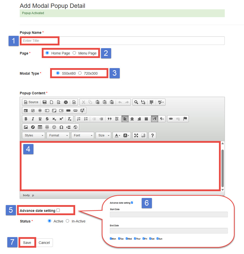 Click on Advanced Date Settings (5) to set specific days and dates (6) for when the popup should appear.