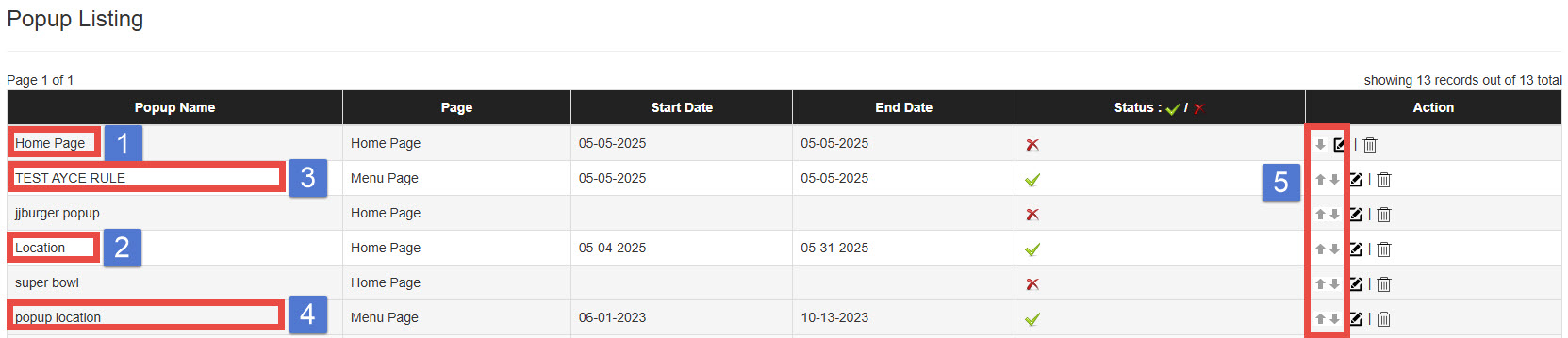 If multiple popups are active at the same time, the system will display the one with the highest priority based on the order in the admin list.