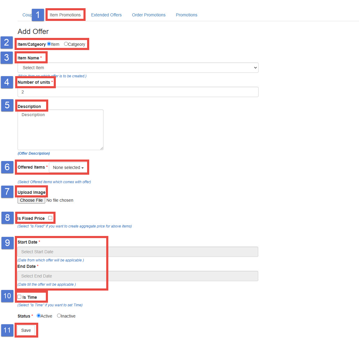- Offered Items: Specify the promotional item that will be offered once the conditions are met. For example, if the specified item is purchased, the customer will receive the offered item at a discounted price.